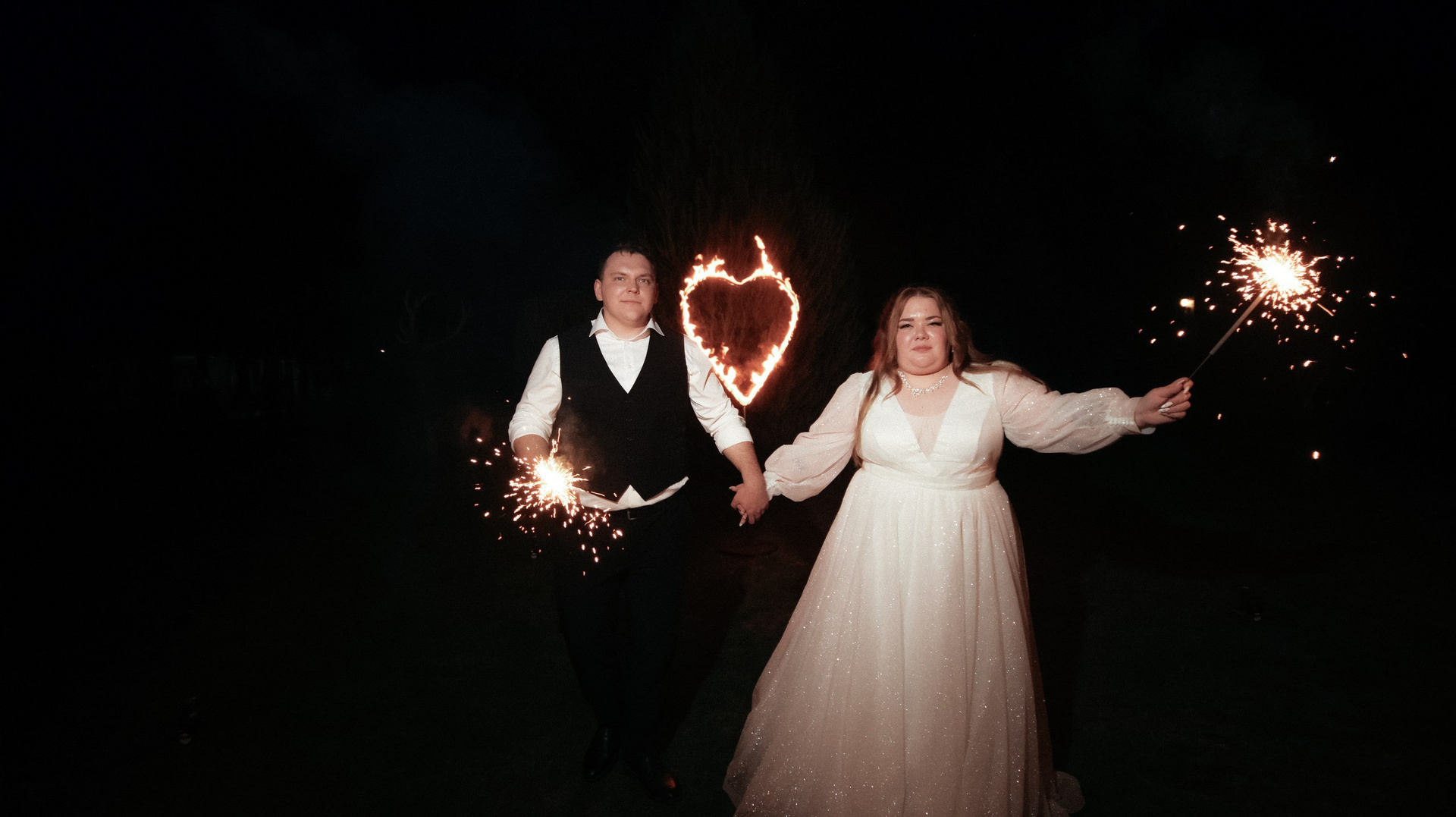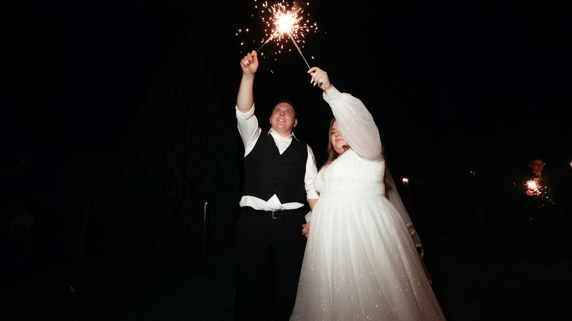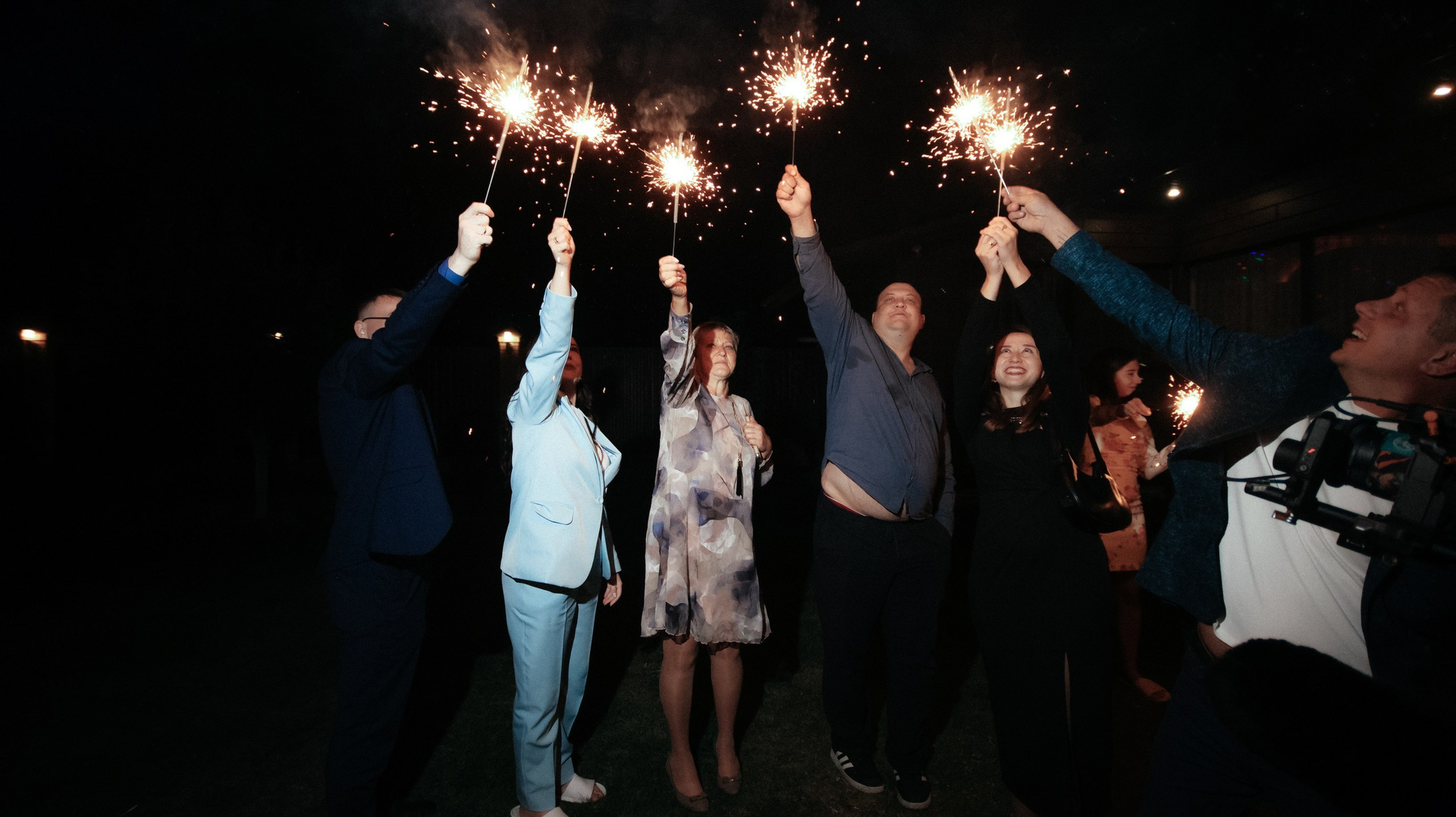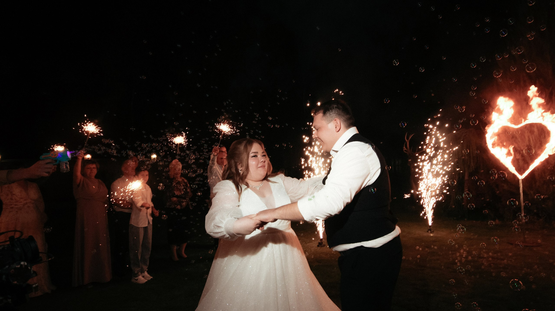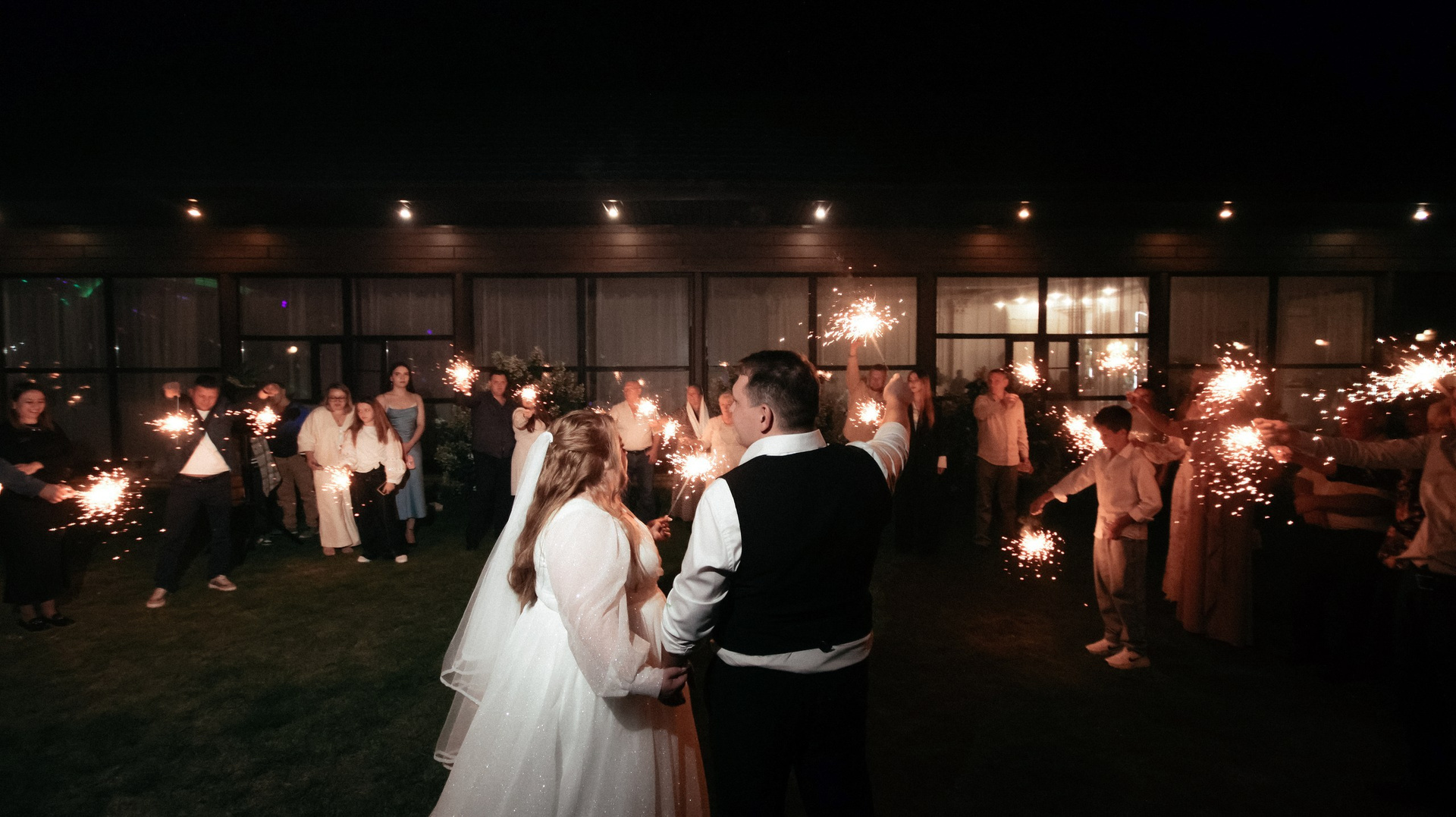 Отдельно хочу отметить финал вечера: когда гостей выстроили с бенгальскими огнями, вы всех скоординировали, подсказали, как встать и что делать. Это мои любимые фотографии — там идеально получилось всё: и момент, и эмоции, и мы, и даже платье лежит красиво.