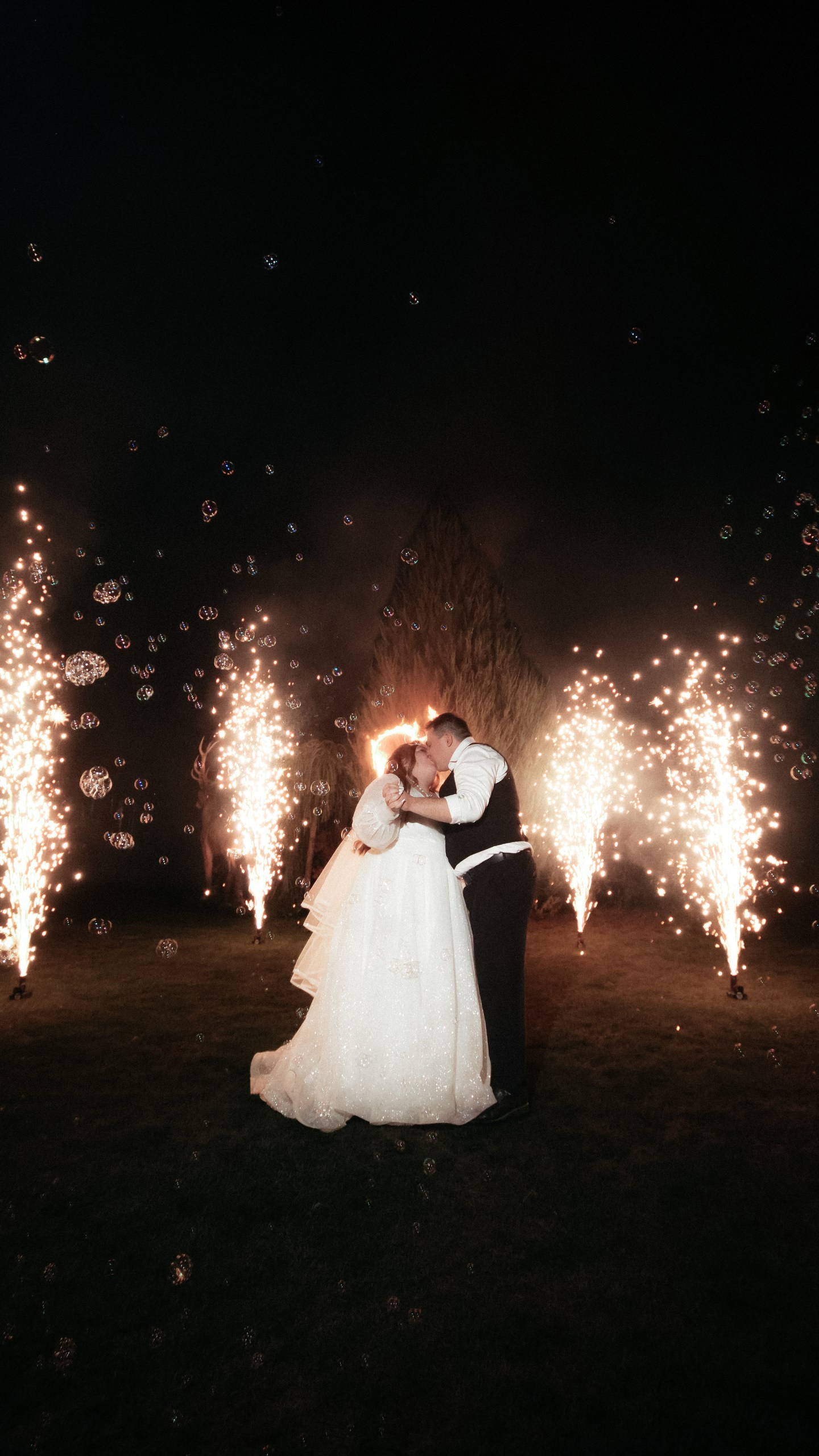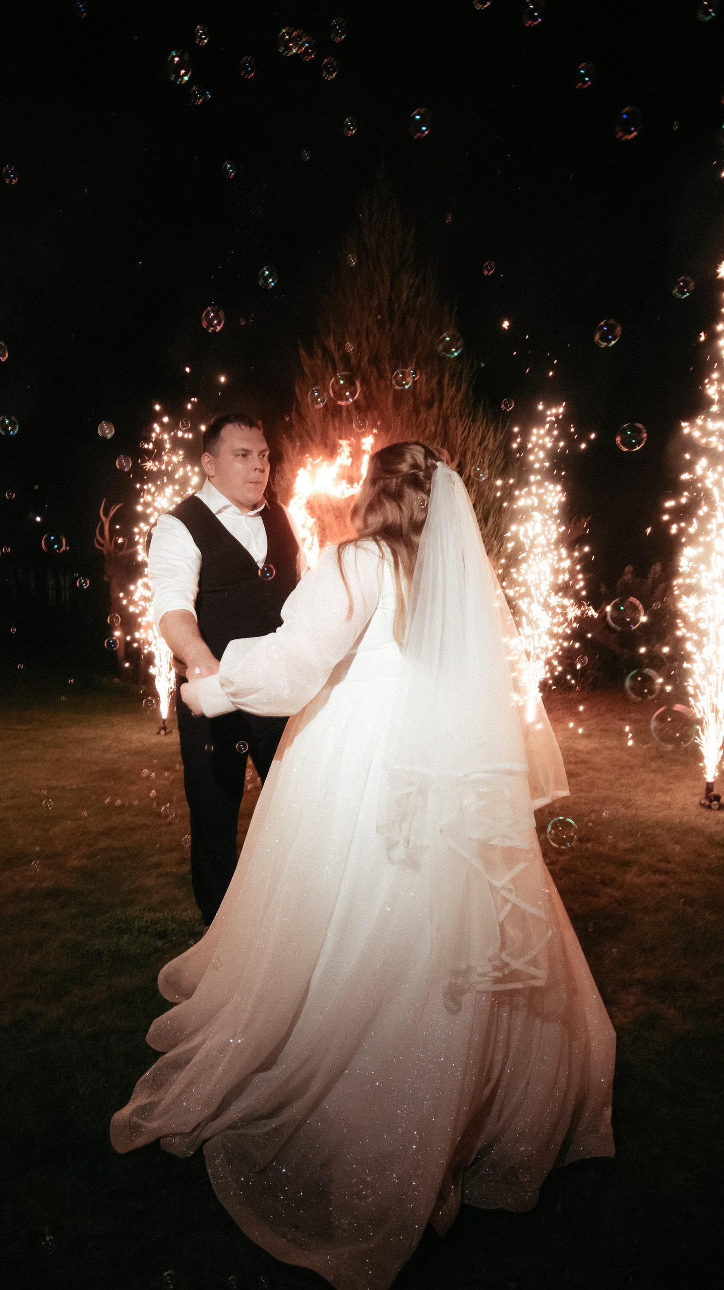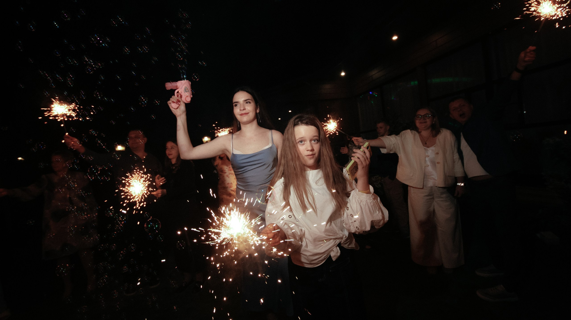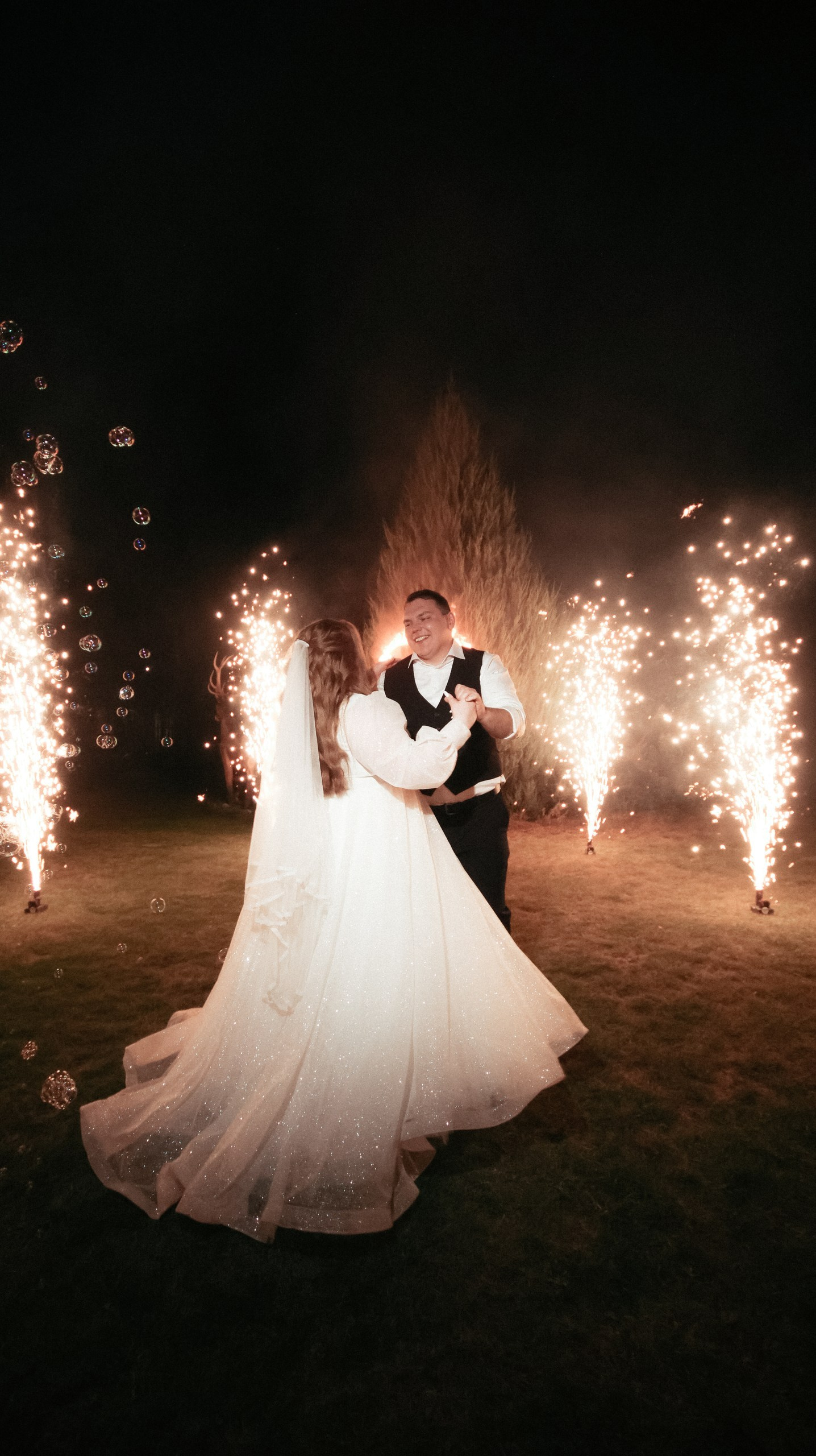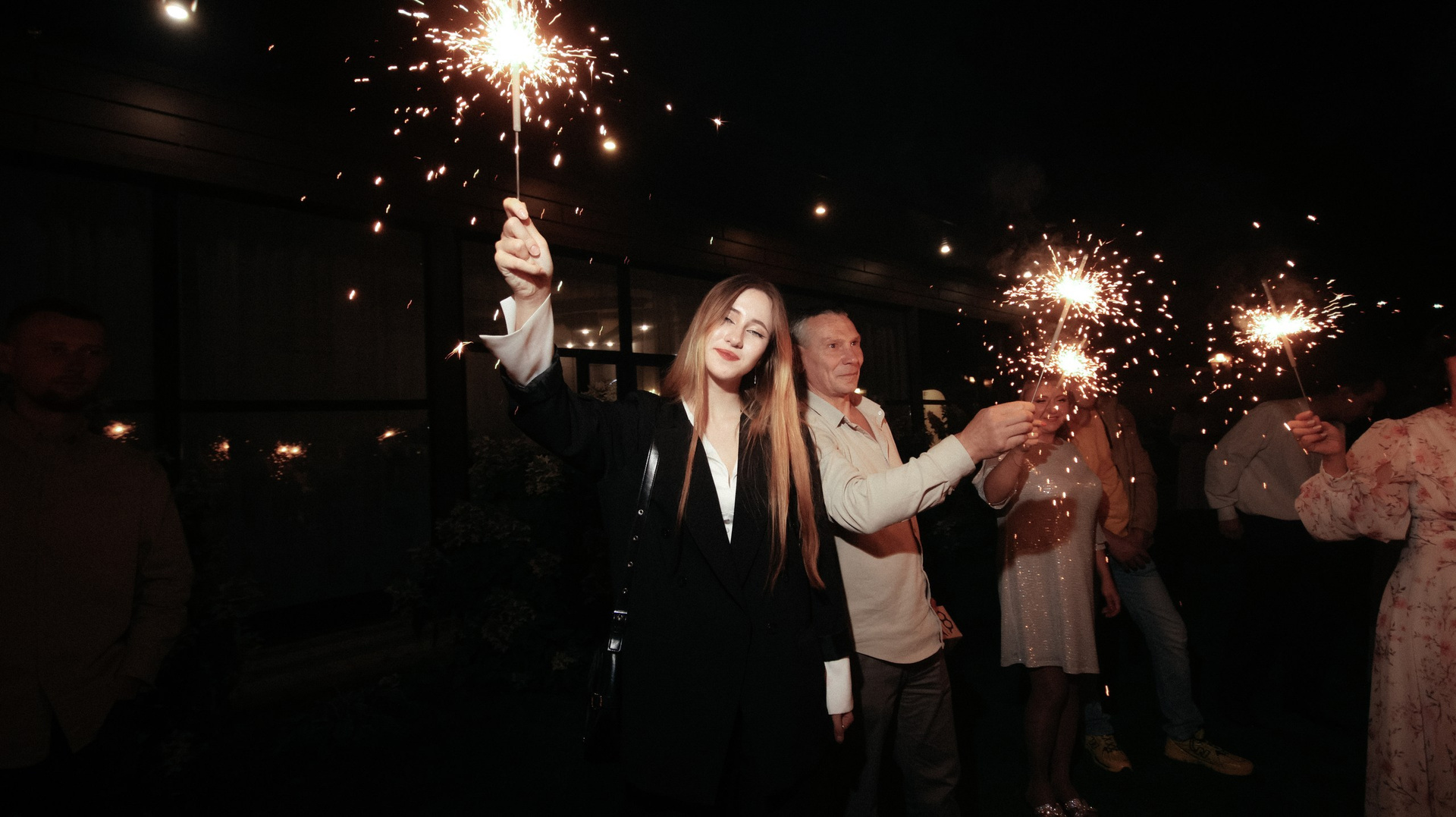Отдельно хочу отметить финал вечера: когда гостей выстроили с бенгальскими огнями, вы всех скоординировали, подсказали, как встать и что делать. Это мои любимые фотографии — там идеально получилось всё: и момент, и эмоции, и мы, и даже платье лежит красиво.