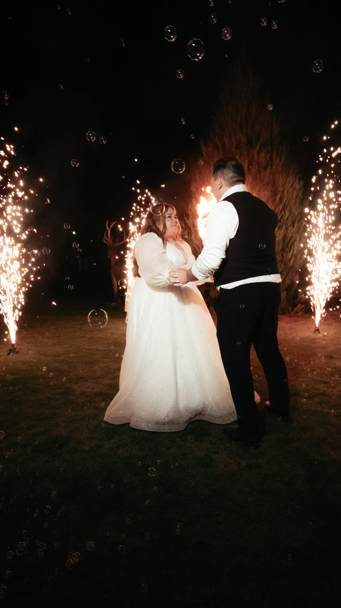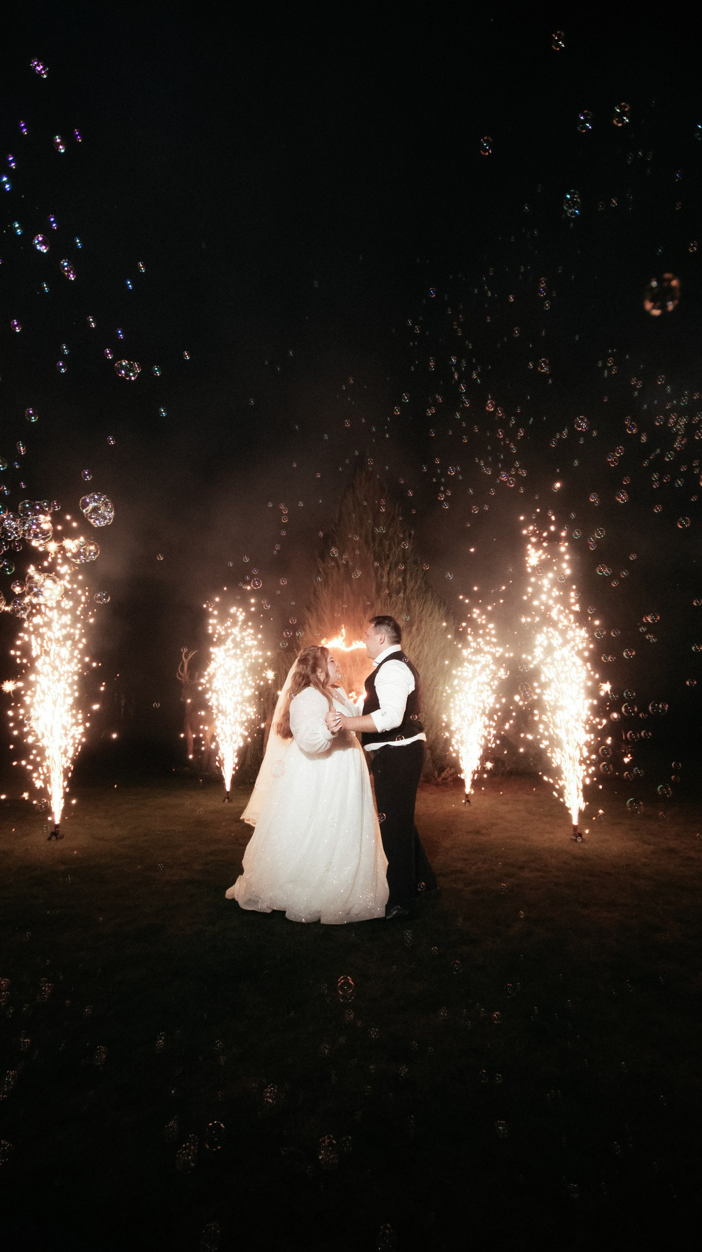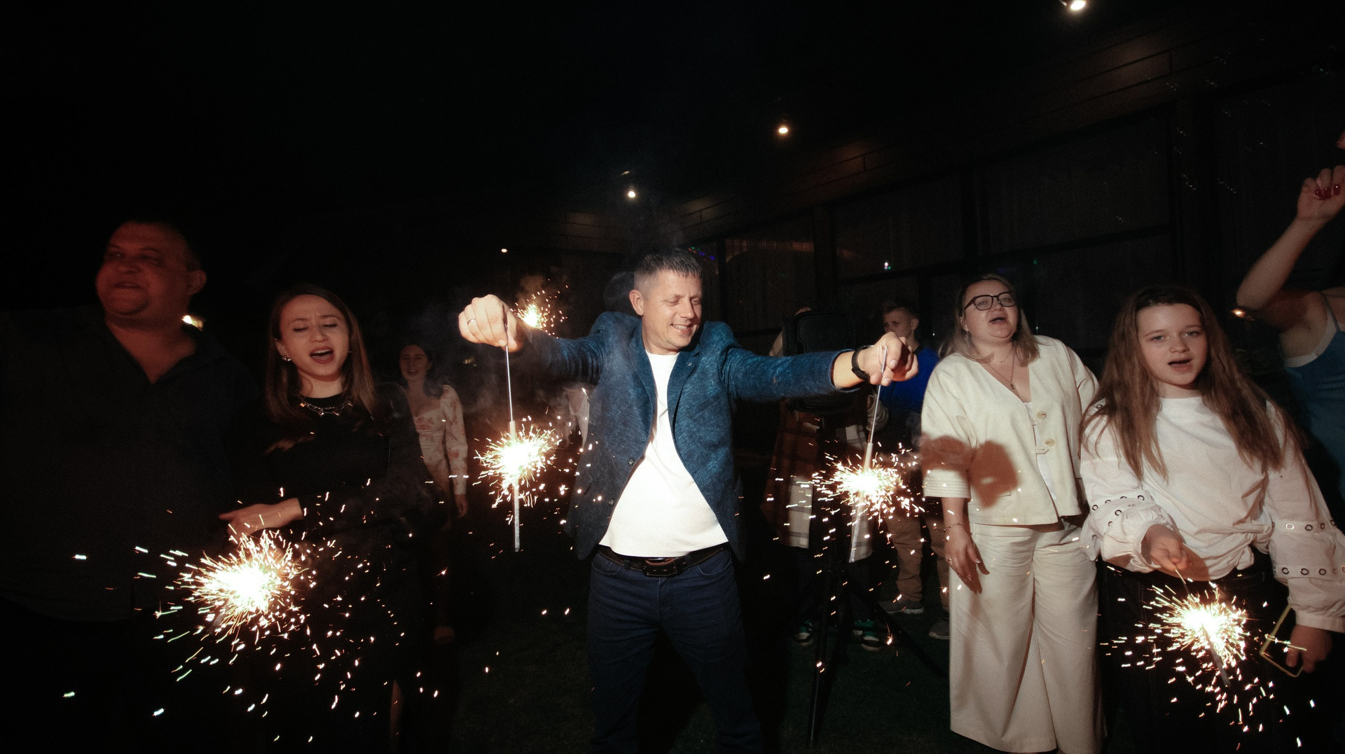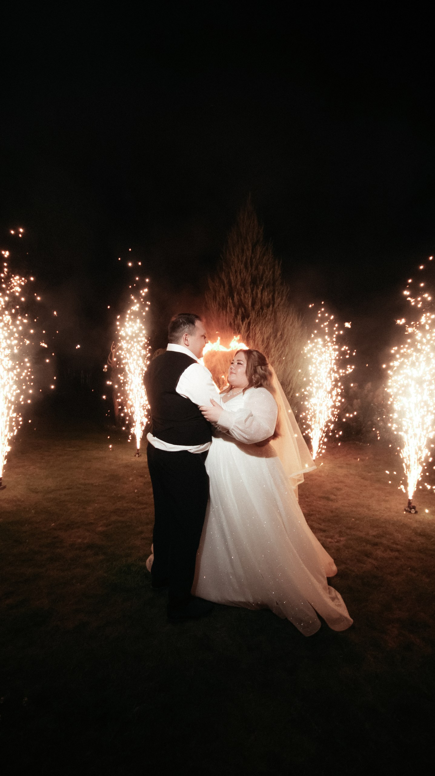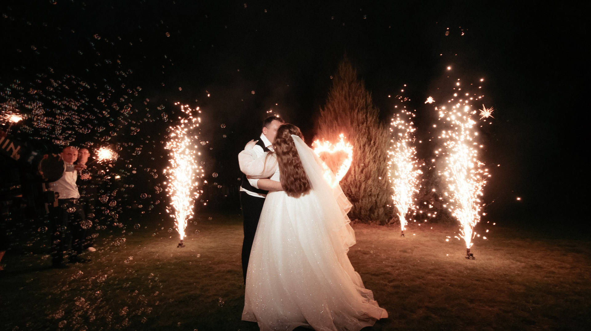 Отдельно хочу отметить финал вечера: когда гостей выстроили с бенгальскими огнями, вы всех скоординировали, подсказали, как встать и что делать. Это мои любимые фотографии — там идеально получилось всё: и момент, и эмоции, и мы, и даже платье лежит красиво.