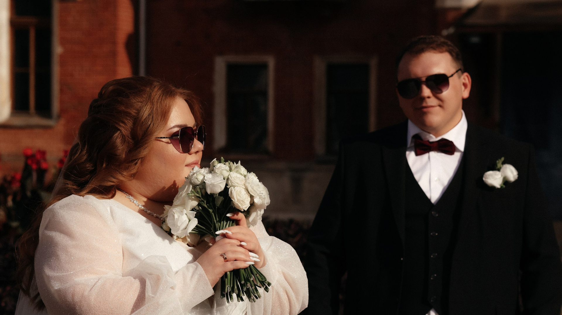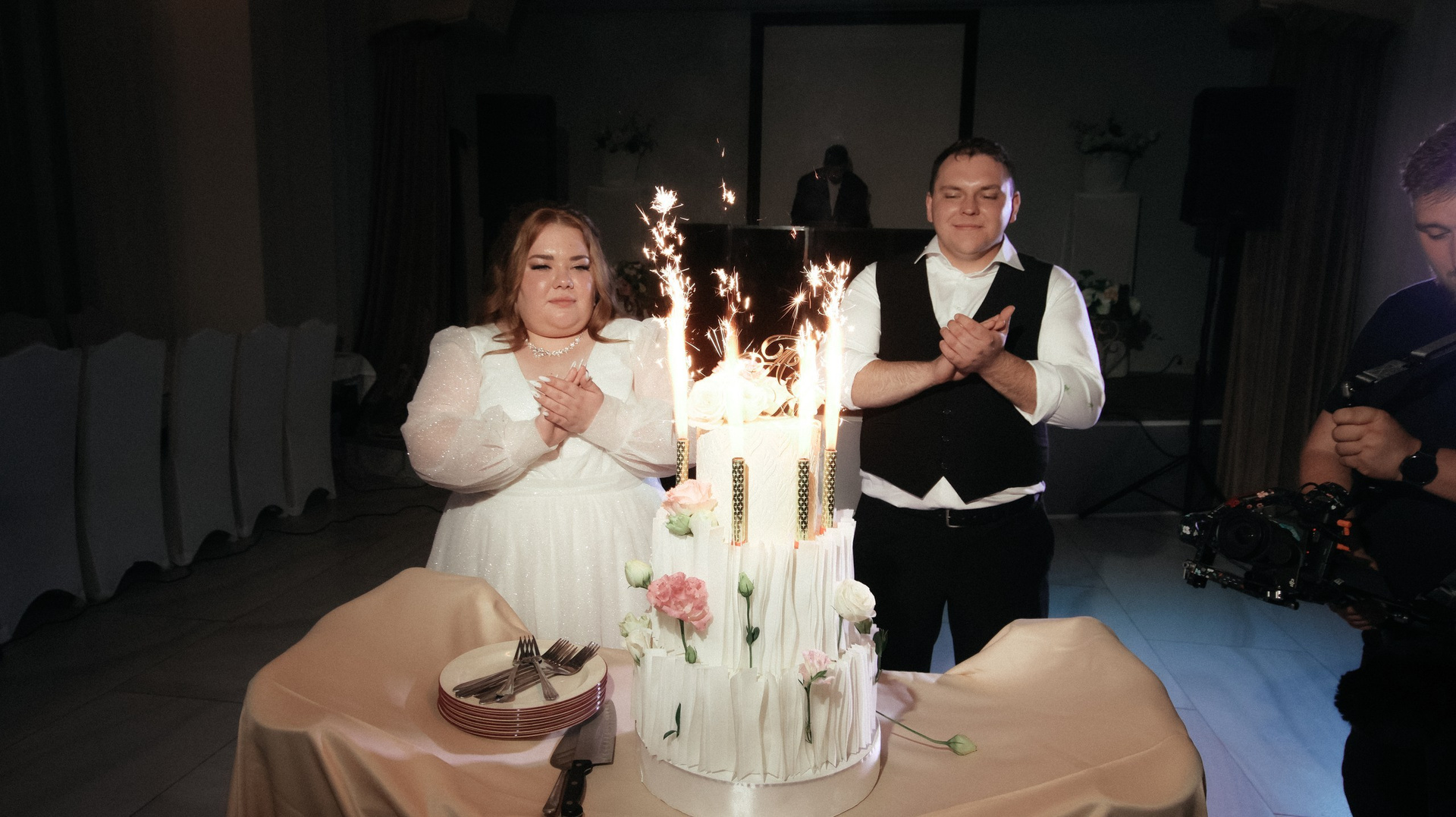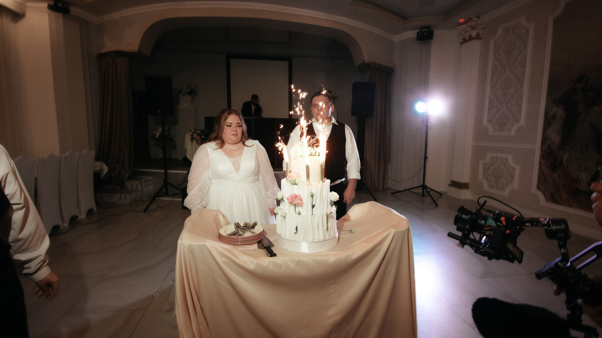 Перед камерой сначала было некомфортно, особенно в ЗАГСе — я плакала почти без остановки. Но потом камера стала как будто незаметной: будто она есть — и будто её нет. После ЗАГСа на прогулке уже было легко, а на банкете я вообще перестала обращать внимание и чувствовала себя свободно.